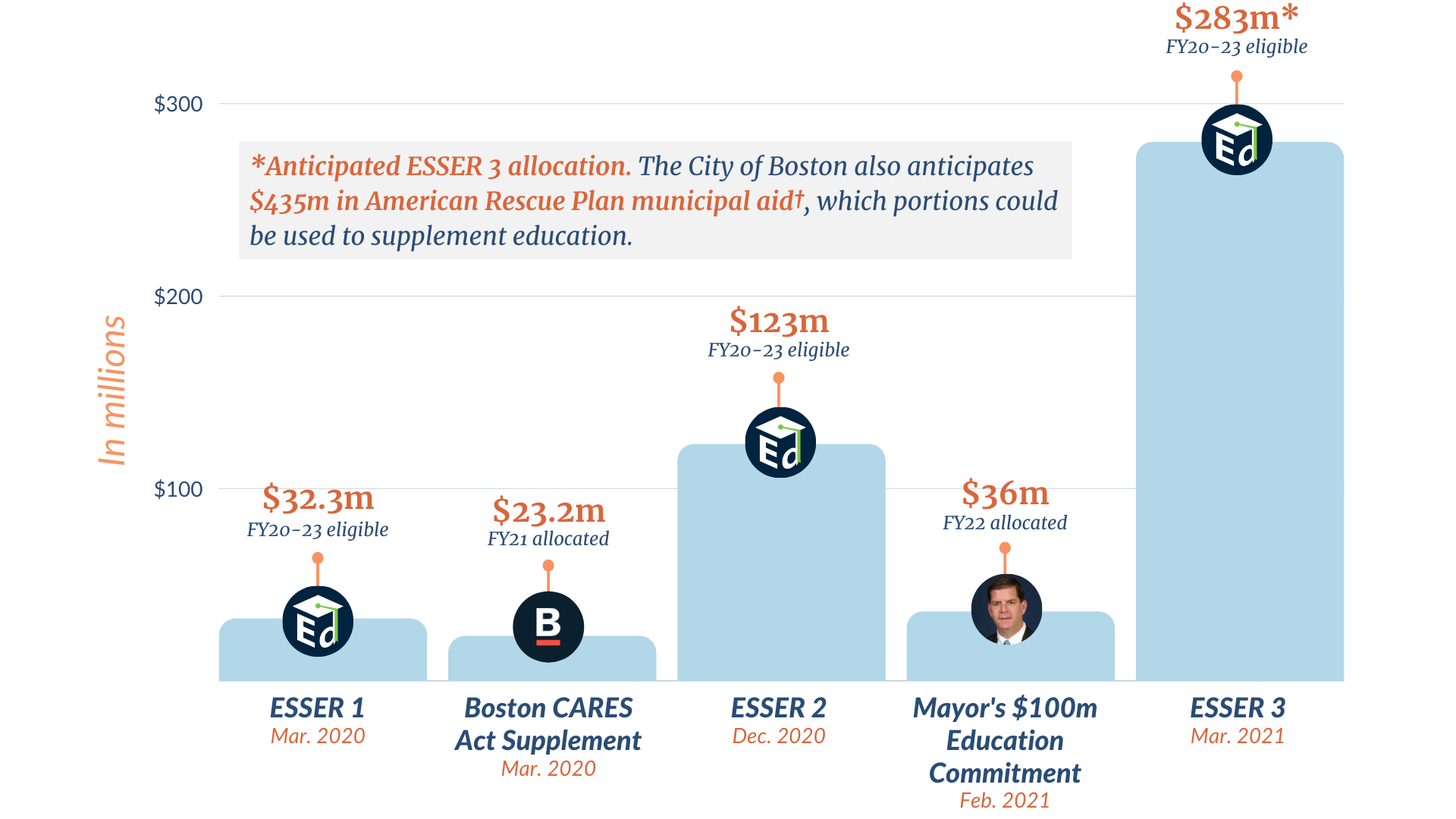 Both the City of Boston and BPS have received considerable federal aid since March 2020. When totaling all the federal aid made available since then (including the estimated $283 million in ESSER 3 funds), BPS has approximately $461 million dollars — nearly half a billion — earmarked solely for education.