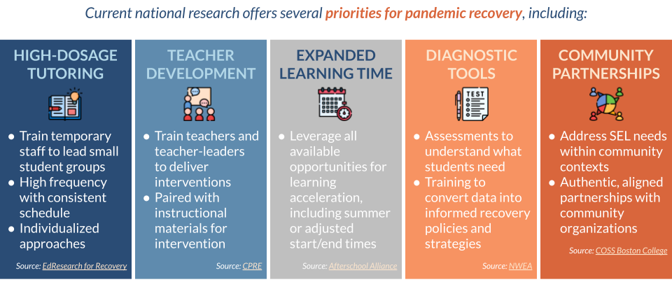There is a need for good data to drive informed, responsive decisions around recovery, as both our school leaders shared and NWEA has affirmed in a December 2020 report. And as our sample of BPS school leaders notes, these kinds of large-scale interventions require professional development for teachers to implement said interventions, as CPRE reiterated in a November 2020 report.
