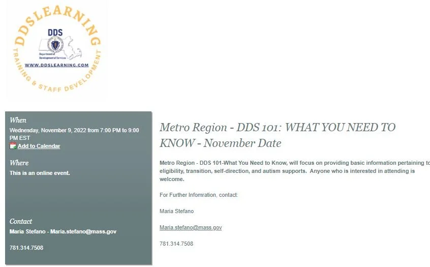 Metro Region - DDS 101-What You Need to Know, will focus on providing basic information pertaining to eligibility, transition, self-direction, and autism supports. Anyone who is interested in attending is welcome.