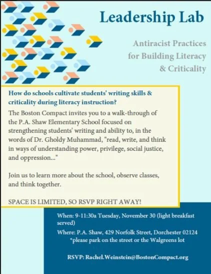 Back to All Events Antiracist Practices for Building Literacy & Criticality Tuesday, November 30, 2021 9:10 AM 11:30 AM P.A. Shaw Elementary School 429 Norfolk Street Dorchester, MA 02124 (map) Google Calendar ICS