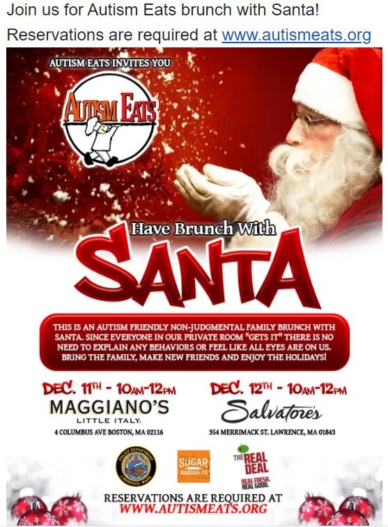 Autism Eats: Have Brunch with Santa Saturday, December 11, 2021 10:00 AM 11:00 AM Maggiano's Little Italy 4 Columbus Ave Boston, MA 02116 Suffolk (map) Google Calendar ICS