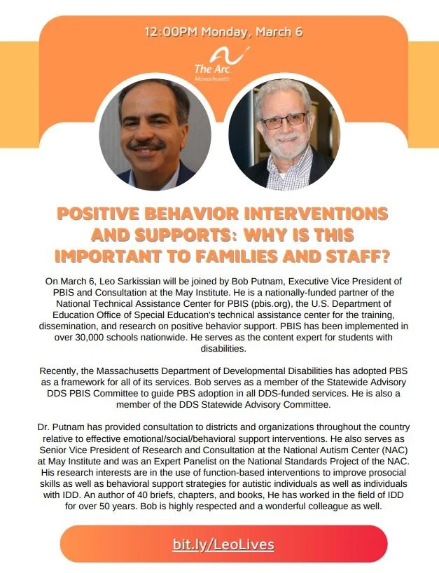 Join The Arc of Massachusetts Executive Director Leo Sarkissian for his monthly webinar presentation, ranging on topics from the COVID-19 pandemic, ongoing legislative priorities, resources and information from the community, and more.
