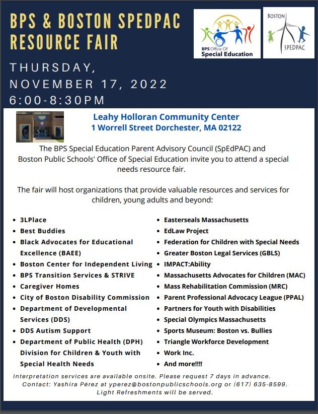 SpEdPAC & OSE Resource Fair Thursday, November 17, 2022 6:00 PM 8:45 PM Google Calendar ICS SpEdPAC & OSE Resource Fair 6 PM - 8:30 PM at the Leahy Holloran Community Center1 Worrell Street Dorchester, MA 02122. Childcare, Interpreters, Raffles, Refreshments and Resources for families with students ages 3-22.