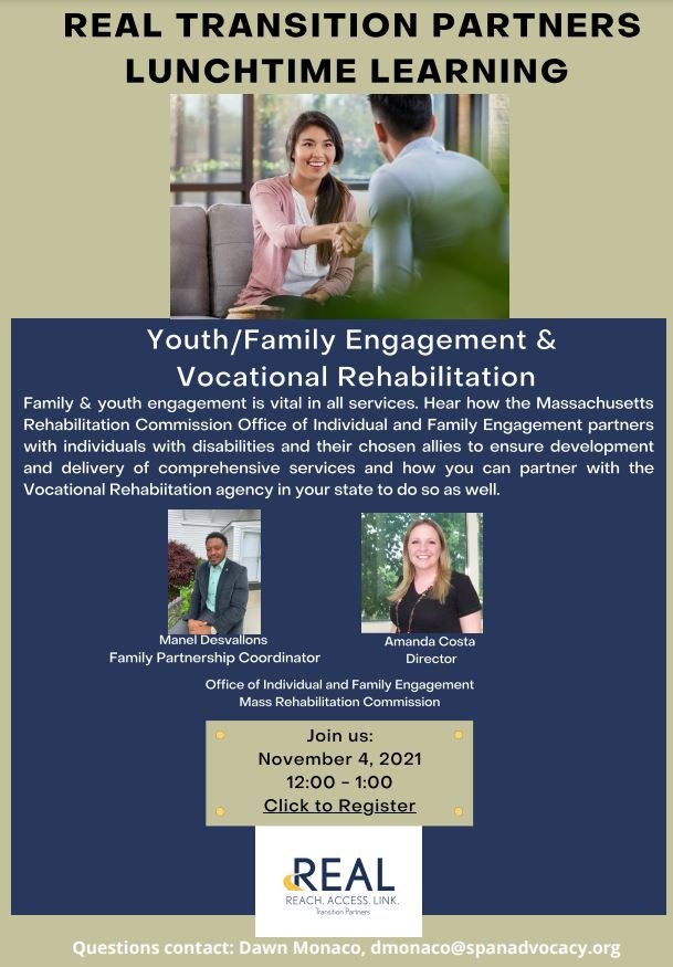 Youth/Family Engagement & Vocational Rehabilitation Thursday, November 4, 2021 12:00 PM 1:00 PM Google Calendar ICS Register Here
